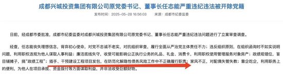 2025年5月,经成都市委批准,成都市纪委监委对成都兴城集团原党委书记、董事长任志能严重违纪违法问题进行了立案审查调查。